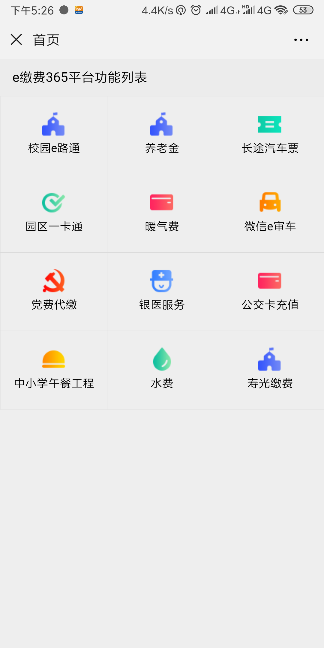 图1 1、扫描成功后,点击【业务办理】,选择e缴费365,随后选择校园e路通,页面如图1所示,进入下一页菜单,再如图2 所示:选择【缴费】菜单, 【城市】下拉列表中选择【泰安】,【单位】下拉列表中选择【山东省泰安第一中学】,输入编号(学生身份证号)、输入姓名,点击【查询】。