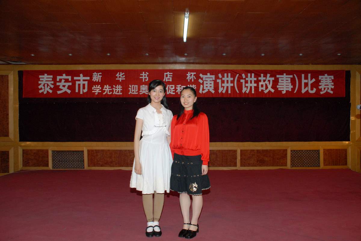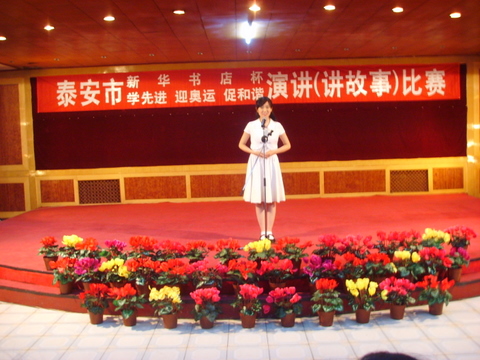 2008420下午,泰安市“新华书店杯”“学先进、迎奥运、促和谐”演讲(讲故事)比赛在市新华书店隆重举行,我校高二学生刘雅琦和高一学生郭明明双双获得一等奖。刘雅琦同学演讲的《我愿做一枚“中国印”》,以其高昂的激情,富有感染力的声音,赢得了评委的一致好评,获得全场最高分9.74分。刚刚在山东省科技创新大赛荣获金奖,载誉归来的高一选手郭明明,她演讲的《秋水》感情真挚、深沉,令现场观众、评委产生心灵的共鸣,无不为之动容。