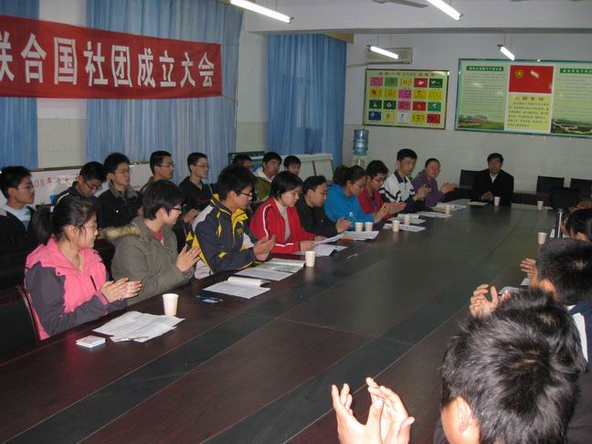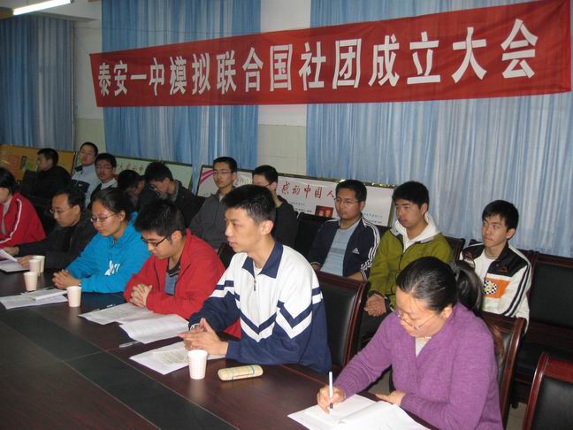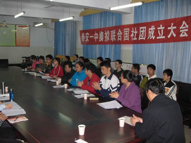 泰安一中模拟联合国学生社团举行成立仪式暨第一次模联活动 2009年3月21日,泰安一中模拟联合国学生社团在泰安一中团校召开了成立大会,会议由高一学生会主席封蔚然同学主持。模拟联合国学生社团团长代表社团成员宣读了社团宗旨、章程、活动计划。李秀笃副校长、张玉良副主任到会表示了热烈祝贺。成立仪式结束后,模拟联合国学生社团开展了第一次活动,活动的议题是“联合国千年计划之环境保护”。指导教师刘元国老师对活动作了有针对性的指导和点评。
